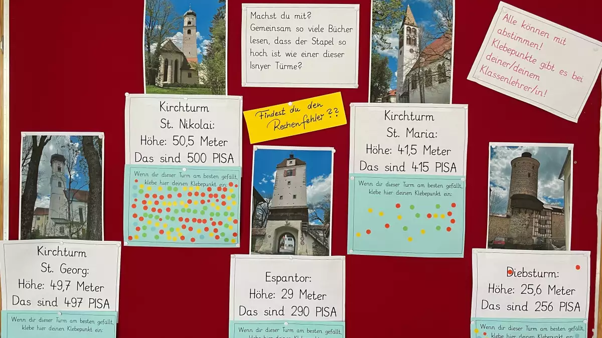 Alle Kinder haben darüber abgestimmt, welcher der Isnyer Türme unser neuer Bücherturm werden soll. Gewonnen hat der Turm der St.-Nikolai-Kirche. Er erhielt 118 der 332 Stimmen. Jedes Kind konnte einen Klebepunkt unter seinen Lieblingsturm setzen. Damit haben wir ein neues, ehrgeiziges Ziel: Mit 50,5 Metern ist der St-Nikolai-Turm der höchste Turm der Stadt. Wir sind gespannt, welche Klasse unser neuer Monatssieger wird.