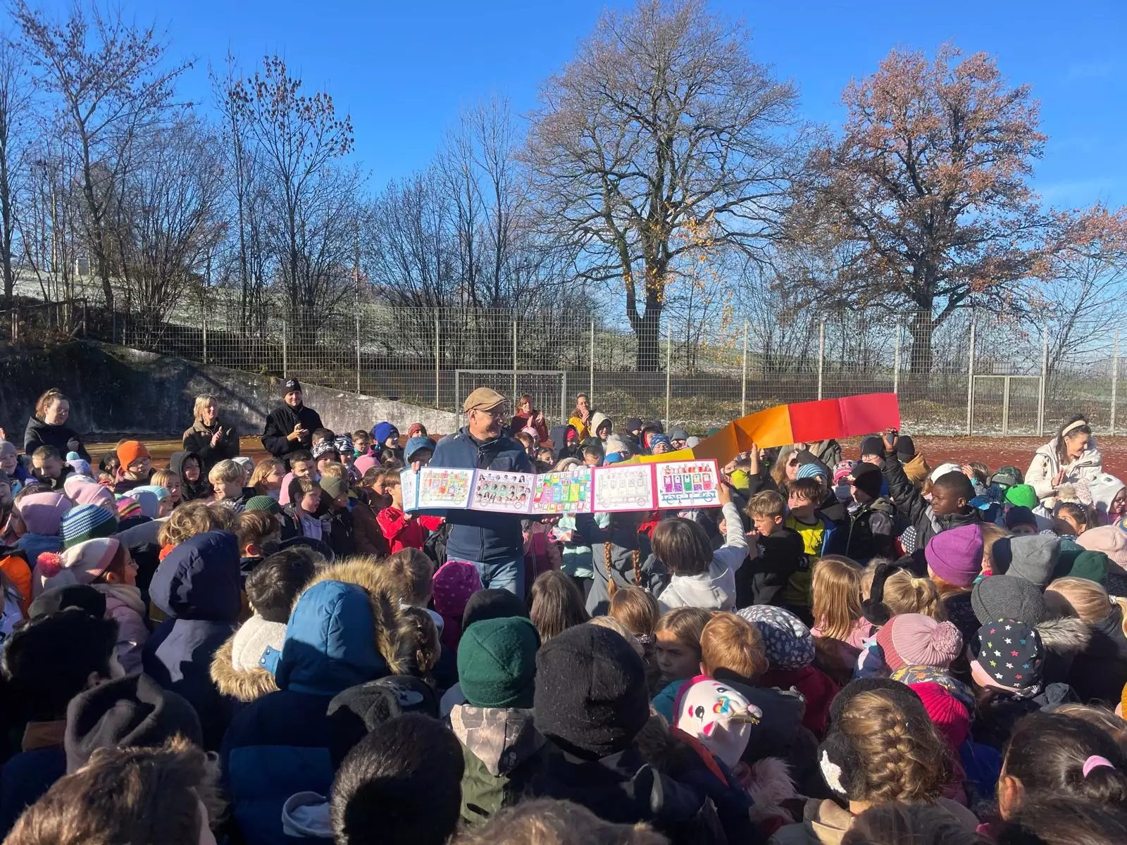 Verabschiedung auf dem Schulhof. Alle Kinder der Schule bildeten einen Kreis um Herrn Hinze und